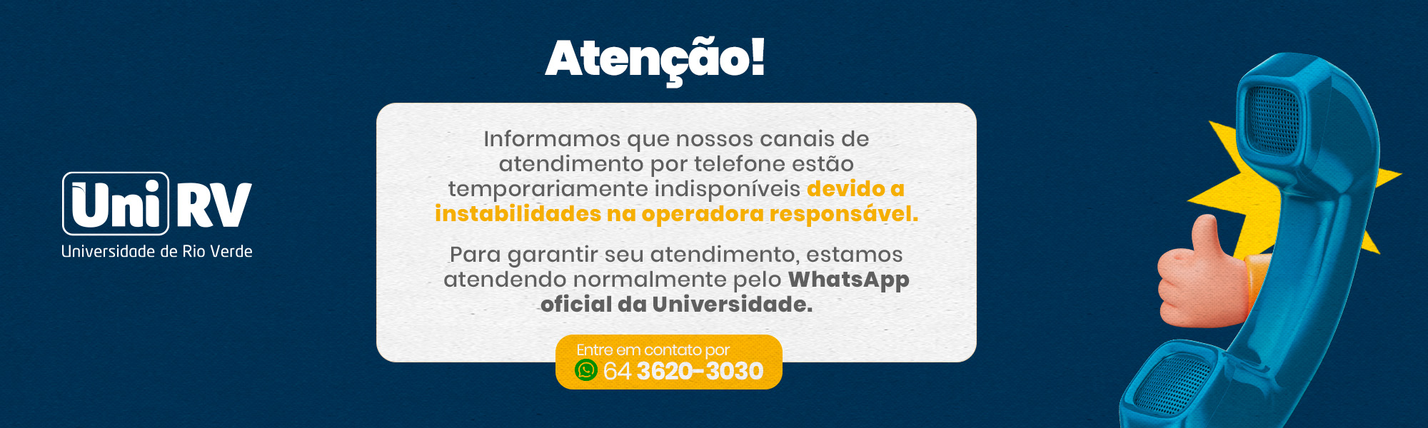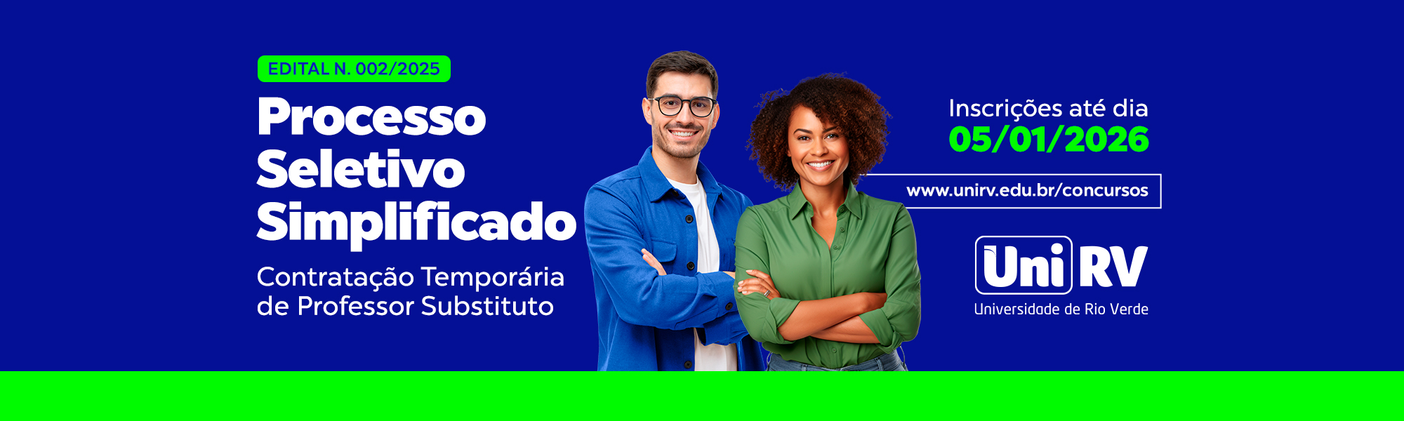 A Universidade de Rio Verde - UniRV é uma conquista histórica do povo rio-verdense. Nos últimos anos, cresceu, consolidou-se como Universidade de grande porte, tornou-se referência e uma das mais bem conceituadas do Brasil. Trabalho sério e de qualidade que é desenvolvido pela administração superior, docentes, servidores técnicos-administrativos e acadêmicos, e que tem se revertido em credibilidade acadêmico-científica junto à sociedade.